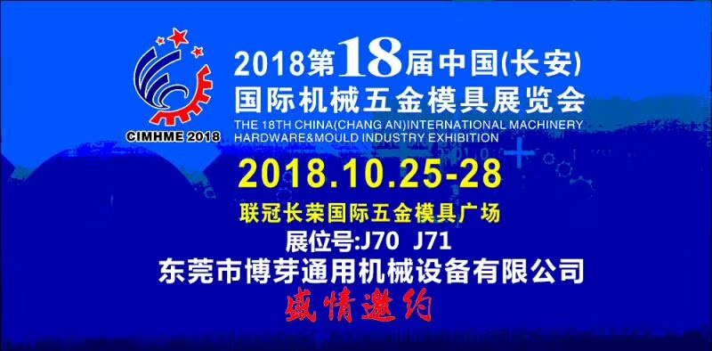 展會(huì)名稱(chēng):第18屆中國(guó)(長(zhǎng)安)國(guó)際機(jī)械五金模具展覽會(huì)時(shí)間:2018年10月25-28日地點(diǎn):廣東省東莞市主辦方:廣東亞聯(lián)展覽股份有限公司展會(huì)地址:聯(lián)冠長(zhǎng)榮國(guó)際五金模具廣場(chǎng)備注:18年J70J71...